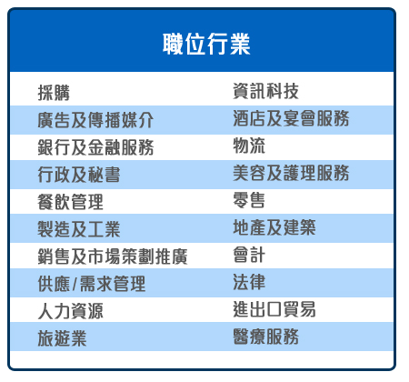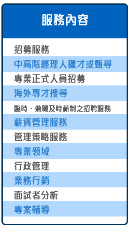 提供一站式 人力資源服務,包括招聘、合約管理、薪酬管理、勞保及強積金。我們擁有各行業專才,為客戶找尋合適的高質人手,協助貴 公司提升業務,解決人事上的煩惱,是值得信賴的人力顧問。